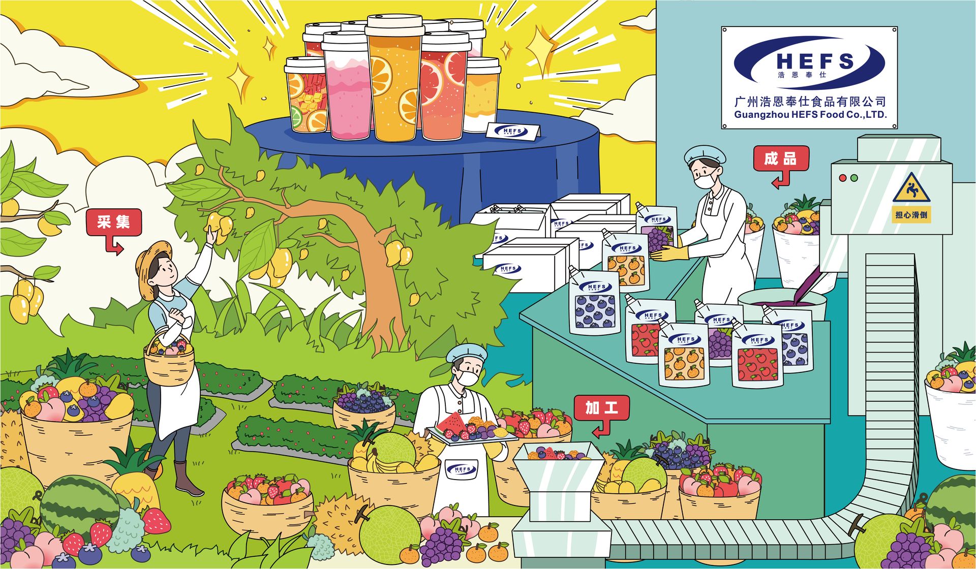 广州浩恩奉仕食品有限公司在26年的发展历程中,先后建立广州水果深加工生产基地、海南椰果深加工生产基地、湖南水果深加工生产基地、苏州深加工生产基地,广州粉圆加工基地、广州椰果深加工生产基地
