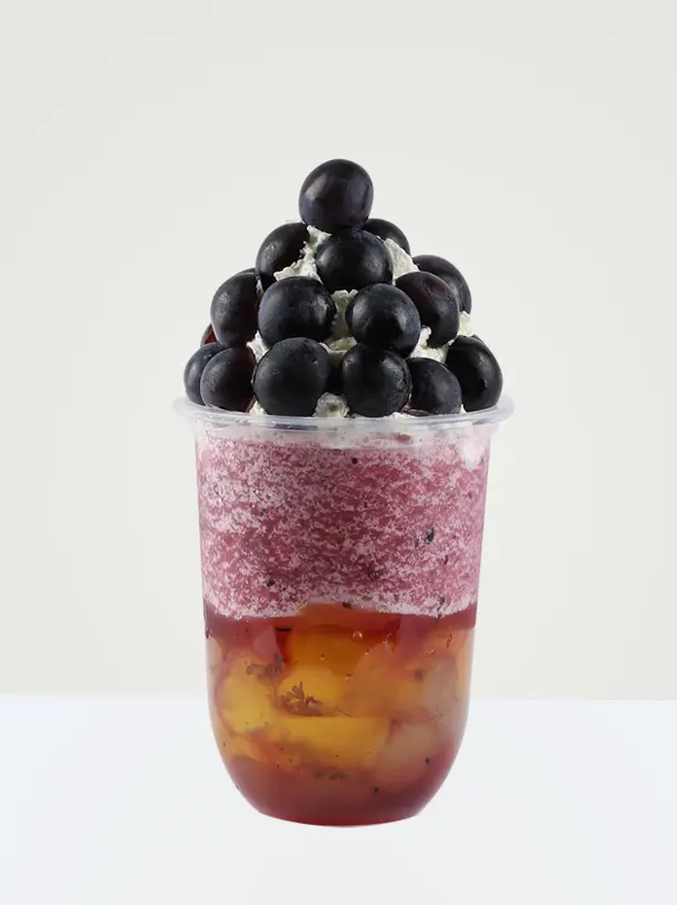 饮品配方: 维果多袋装葡萄果浆50ml;东惠果糖25g;新鲜葡萄60g;奶油顶装饰(新鲜葡萄10颗对半切开装饰);桂花冻100g;冰块200g